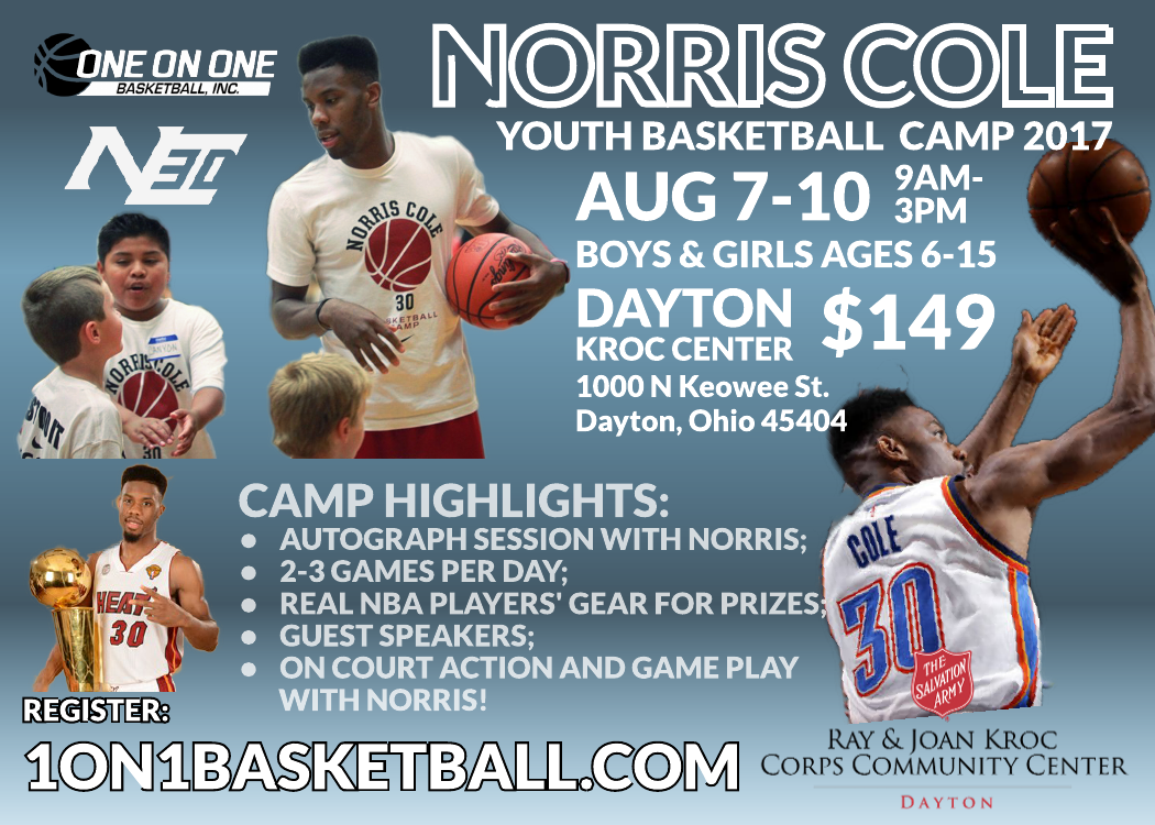 Autograph session with Norris, 2-3 games per day, real NBA players' gear for prizes, guest speakers, on court action and game play with Norris CLICK HERE TO REGISTER Don't miss out, space is limited! MORE INFO? (202) 244-2255 or info@1on1basketball.com